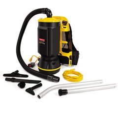 The Rubbermaid Commercial 9VBP06 backpack vacuum cleaner has a 6-quart capacity, an adjustable harness, a 50-foot power cord, and four filtrations stages to improve indoor air quality. Backpack vacuums are more portable than typical canister or upright vacuums and allow the user to move around more quickly. The harness has adjustable shoulder, waist, and chest straps to accommodate different users, a back mesh panel that allows ventilation to help keep users cool, padded shoulder straps to help reduce friction to the shoulders, and a carry handle for lifting the vacuum. The backpack canister has a narrow profile for maneuverability between furniture and in other areas with limited space. This vacuum includes a flexible vacuum hose, two aluminum extension wands, a floor nozzle, an upholstery tool, a crevice tool, and a dusting brush for different cleaning tasks. All included tools are stored onboard for accessibility.
